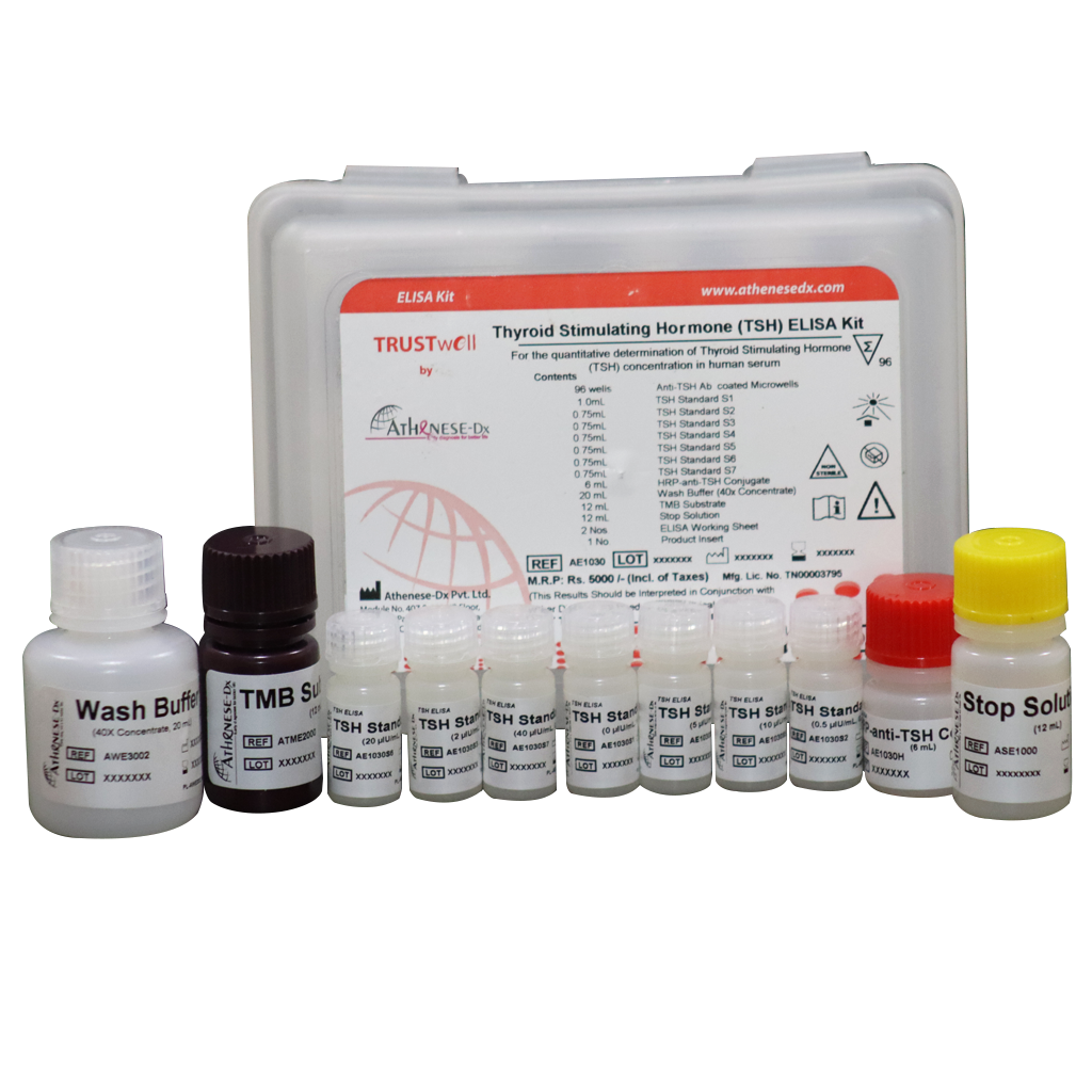 The TRUSTwell TSH ELISA Kit is a solid phase enzyme linked immunosorbent assay for the quantitative determination of the levels of Thyroid Stimulating Hormone (TSH) in human serum.Sensitivity: Detects TSH levels as low as 0.035 µIU/mLSpecificity: No cross reactivity detected with related hormones: FSH, LH and hC Linearity: 1:128 dilution on 36 ?IIU/mL sample Precision: intra assay precision: CV 7.5%; inter assay precision: CV 8.0 % Accuracy: R2= 0.986 against Roche TSH Chemiluminescence ImmunoassayHook effect: No hook effect up to 8000 μIU/mL Interference: not affected by Hemoglobin 500mg/dL, Diltiazem 15uM, Bilirubin 20 mg/dL, Erythromycin 81.6uM, Triglycerides 3g/dL, Verapamil 4.4uM, HAMA 52.5ng/mL, T3 100ng/mL, RF 215IU/mL, T4 100ug/dL, Acetaminophen 1324uM Calibration: Human TSH WHO 3rd International Standards (81/565 NIBSC)Calibrators: 0, 0.5, 2.0, 5.0, 10, 20, 40 µIU/mL in biological matrixShelf life: 18 monthsAssay time: 80 minutes Microwells coated with anti-TSH Ab 1 plate, 96 wells TSH Standards: S1 (0 μIU/mL) 1 mLTSH Standards: S2 (0.5 μIU/mL) 1 mLTSH Standards: S3 (2 μIU/mL) 1 mLTSH Standards: S4 (5 μIU/mL) 1 mLTSH Standards: S5 (10 μIU/mL) 1 mLTSH Standards: S6 (20 μIU/mL) 1 mLHRP-anti-TSH conjugates 6 mL Substrate 12.0 mL TME2000Concentrated wash buffer (40X) 25 mLStop solution 7.5 mL Product insert 1 set