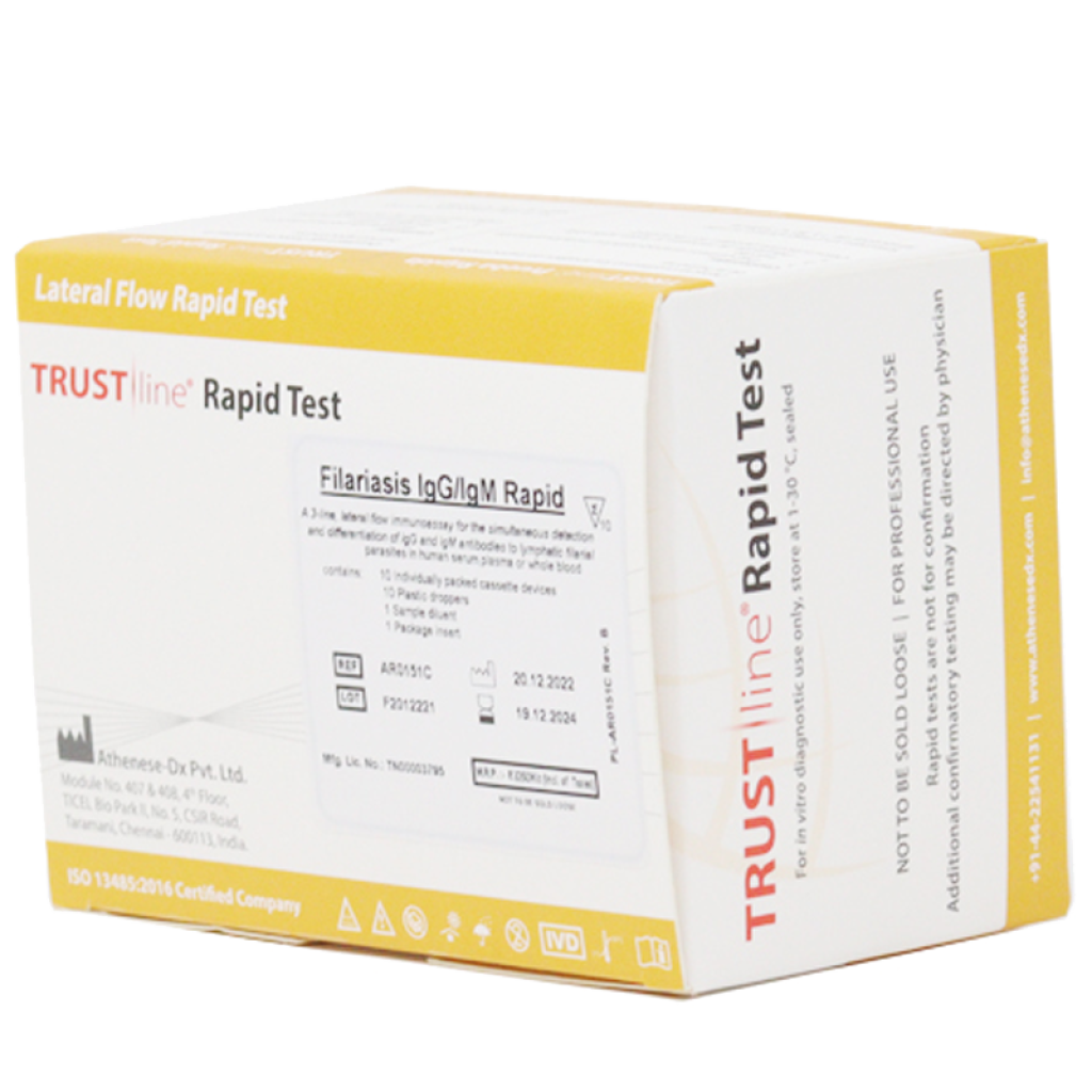 The TRUSTline Filariasis IgG/IgM Rapid Test is a lateral flow immunoassay for the simultaneous detection and differentiation of IgG and IgM anti-lymphatic filarial parasites (W. Bancrofti and B. Malayi)in human serum, plasma or whole blood.