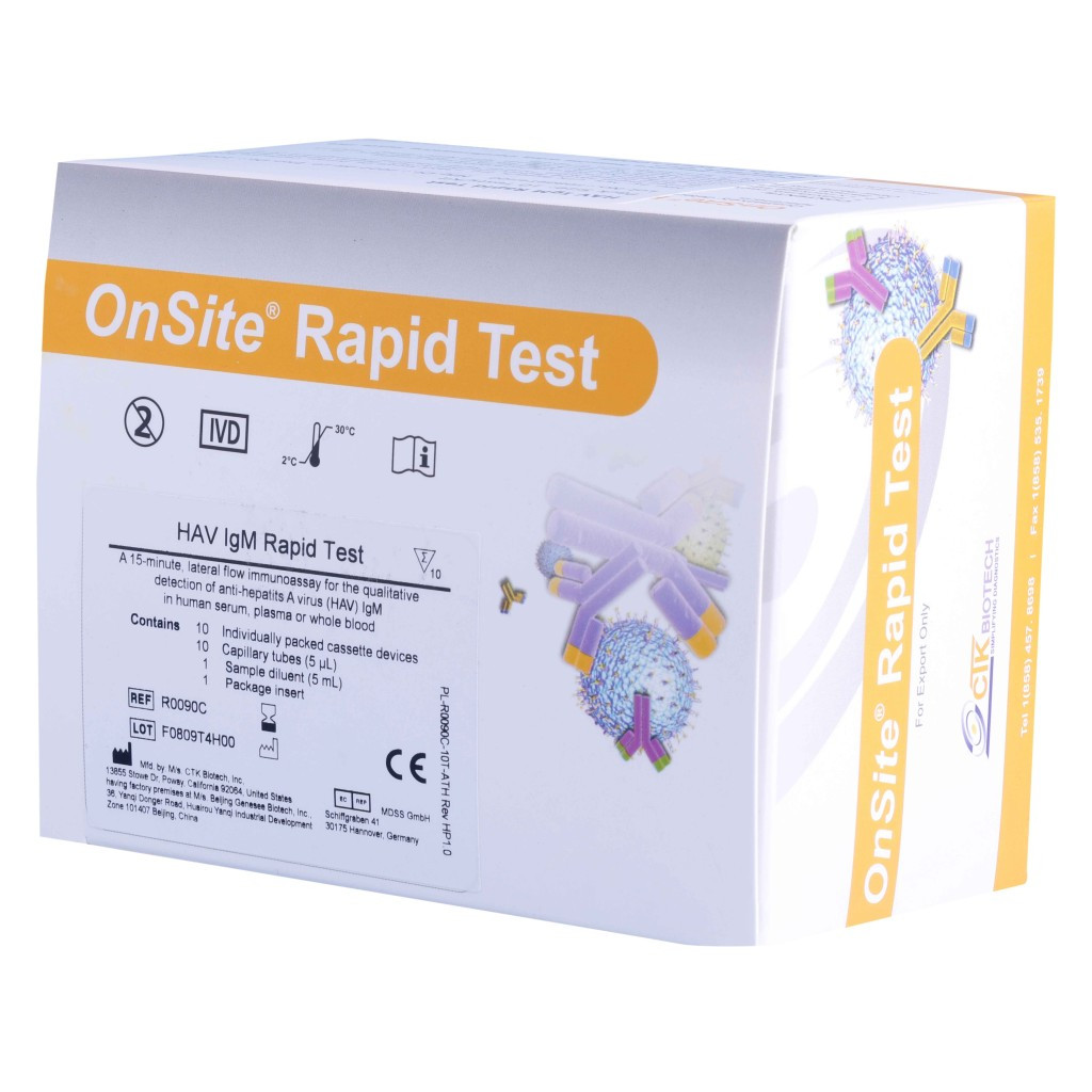The OnSite HAV IgM Rapid Test is a lateral flow immunoassay for the qualitative detection of IgM antibodies to hepatitis A virus (HAV) in human serum, plasma or whole blood.