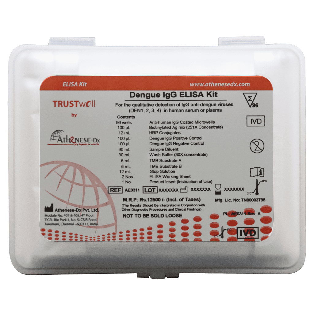 The TRUSTwell Dengue IgG ELISA Kit is a solid-phase, IgG capture enzyme linked immunosorbent assay. The three main kit components are: